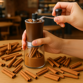 🔹 مناسب برای فضای کافهای و آشپزخانهای ☕🏡 – روی میز چوبی یک کافه یا در آشپزخانه شما، این آسیاب دستی همراه با چوب دارچین 🏺، دانههای فلفل 🔴 و سایر ادویههای خوشبو، فضایی گرم و دلنشین ایجاد میکند.